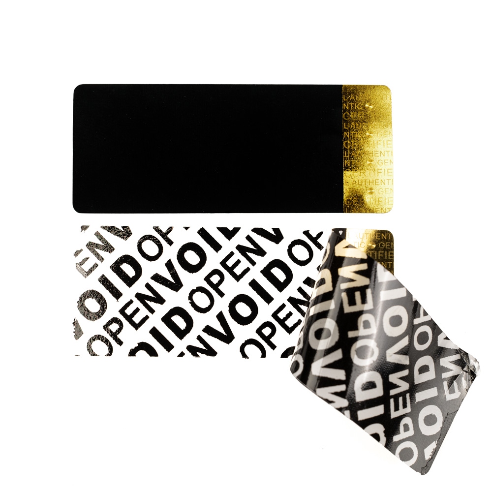Vysoko elegantné čierne reziduálne plombovacie štítky s VOID podkladom a zlatým másterovým hologramom na okraji určené pre potlač v termotransferových tlačiarňach typu ZEBRA či POSTEK k tlači sériových čísel, výrobných čísiel, čiarových kódov, QR kódov, licencií, log výrobcu alebo warranty void if open a iných záručných textov, na plombovanie krabíc, obalov, dverí a ďalšie aplikácie. ... Viac